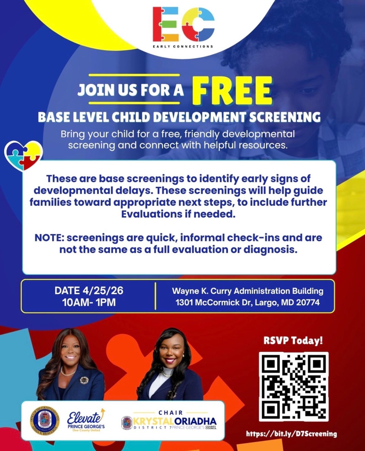 Prince George's County leadership is wrapping up Autism Awareness Month with a summit that is bringing providers, parents/caretakers, and other community resources together to raise awareness about Autism Spectrum Disorder and some of the co-occurring conditions. In addition to round table talks and panel discussions from those with lived experiences and in caretaker roles, opportunities to meet with providers and have 1:1 screenings are available. You don't want to miss this chance to have your questions answered, connect with others and access local quality resources. Register via the QR code or the link: https//bit.ly/D7Screening. We're looking forward to seeing you on Saturday, April 25th, from 10am-1pm at the Wayne K. Curry Administration Building, 1301 McCormick Dr. Largo, MD 20774.