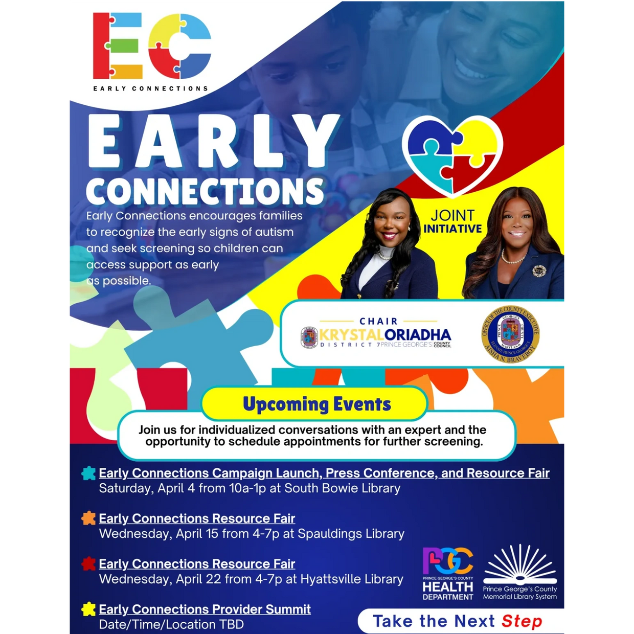 The goals of this campaign are to promote understanding of childhood developmental milestones and neurodevelopmental disorders; expand screening for children ages 0–5; connect Prince George’s County families with local diagnostic and treatment resources; and replace stereotypes with education and acceptance of neurodiversity. As part of this campaign, our county leaderships is partnering with the Prince George’s County Memorial Library System to host resource fairs in each region of the County. The dates and locations of the resource fairs are provided in the flyer attached. The County Executive intends to feature a mix of educational and advocacy groups and clinical providers at each event so that families can have a safe space to learn, ask questions, and, if they choose, make an appointment for screening for their child with a local provider.